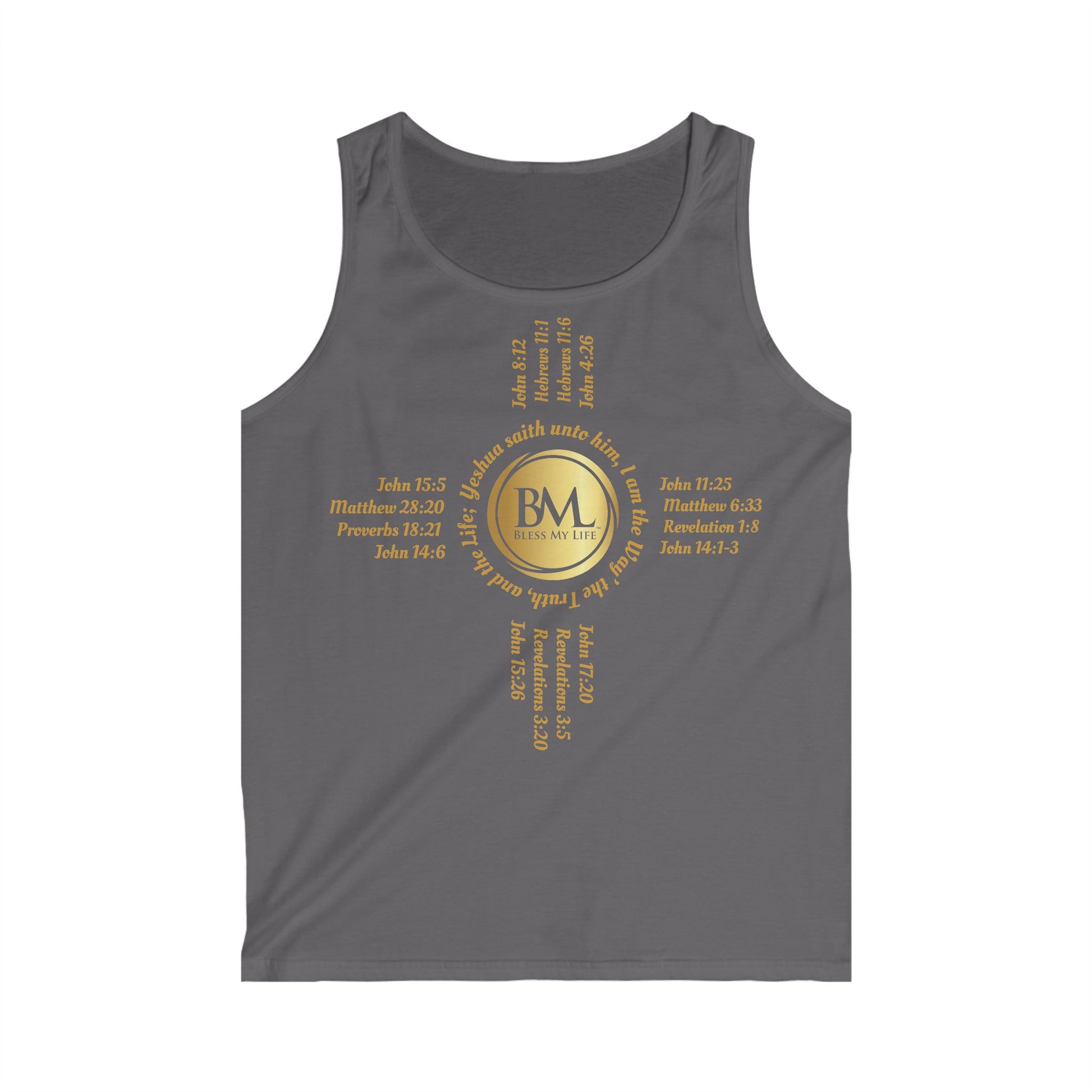 A New Mexican Favorite,Men's Softstyle Tank Top with Biblical Scriptures surrounding BML logo and in the form of the famed & respected Zia Pueblo Symbol
